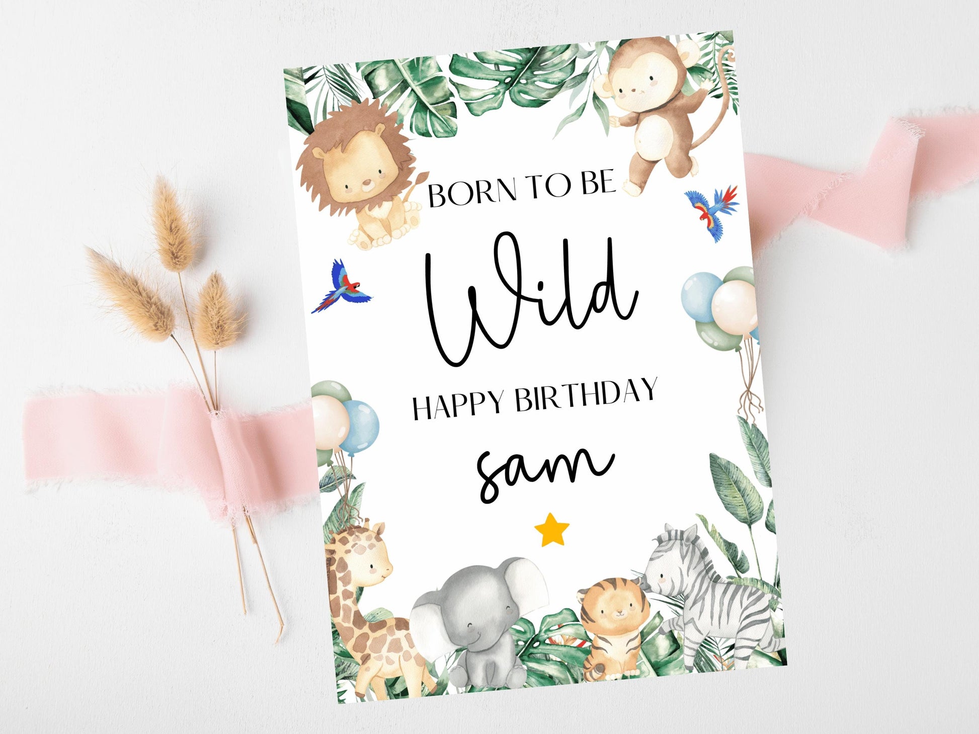 Born to Be Wild Happy Birthday Card/ Safari Theme Birthday Greetings Cards/ Childrens Birthday Party/ Jungle Animals/King of the Jungle Card
