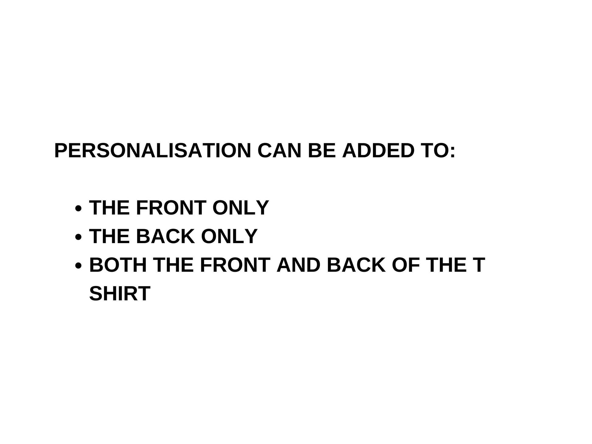 - The personalisation can be added to either the front only, back only or the front and back of the t shirt.