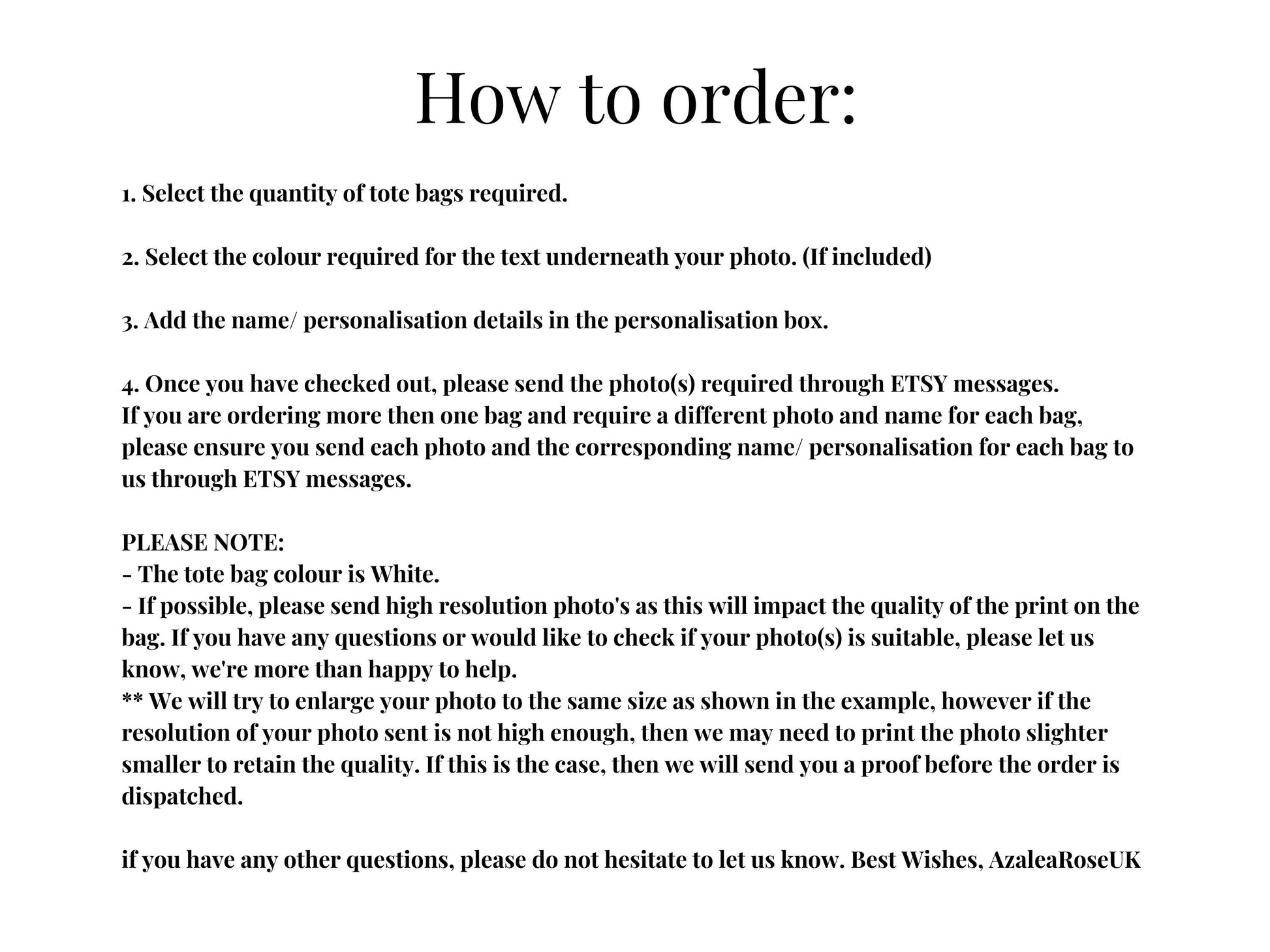 - If possible, please send high resolution photo's as this will impact the quality of the print on the bag. If you have any questions or would like to check if your photo(s) is suitable, please let us know, we're more than happy to help.