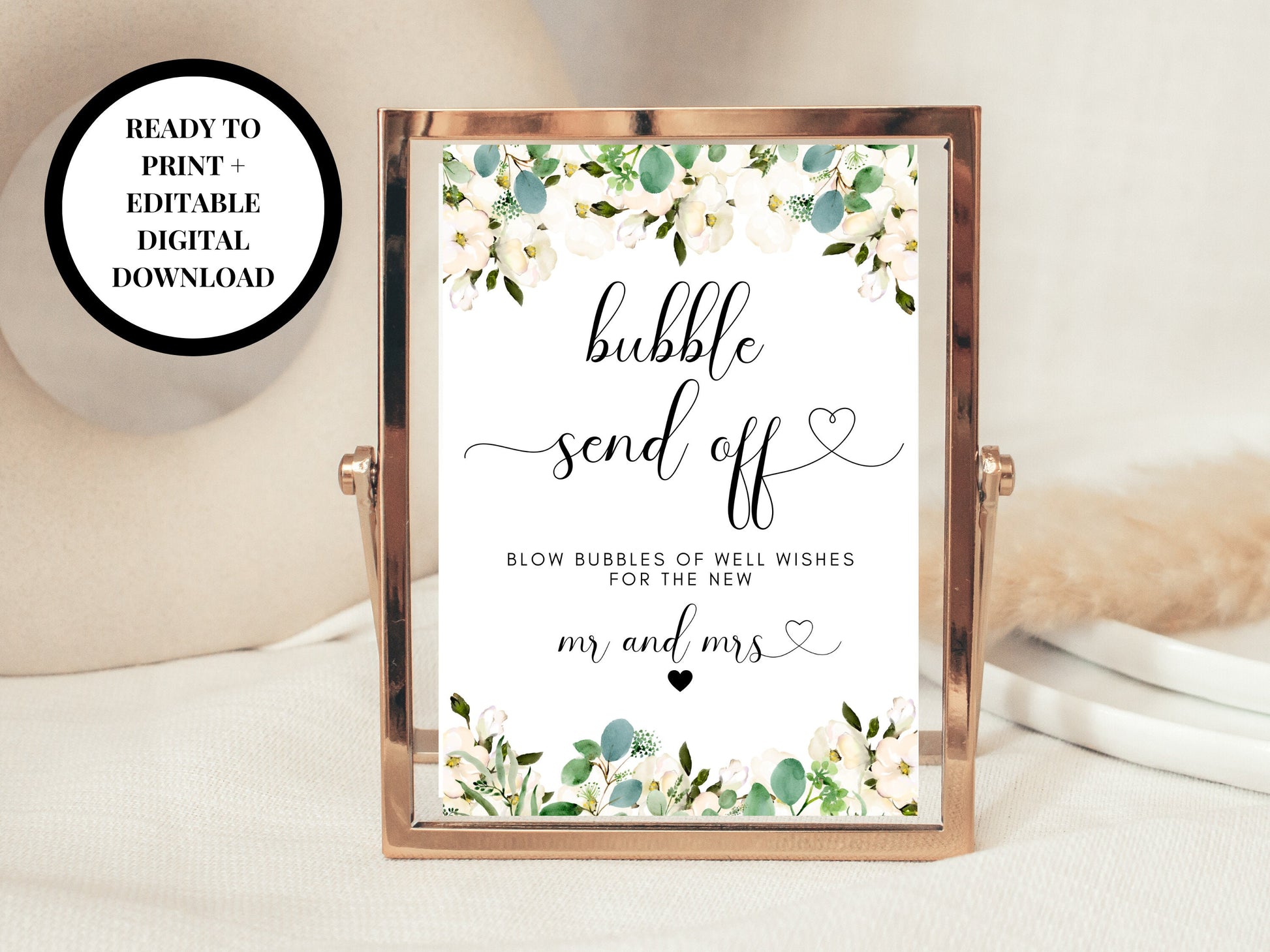 Editable Bubble Send Off Sign/ Greenery Floral Blow Bubbles of Well Wishes for the new Mr and Mrs Sign/ Eucalyptus Bubbles Send Off Sign.