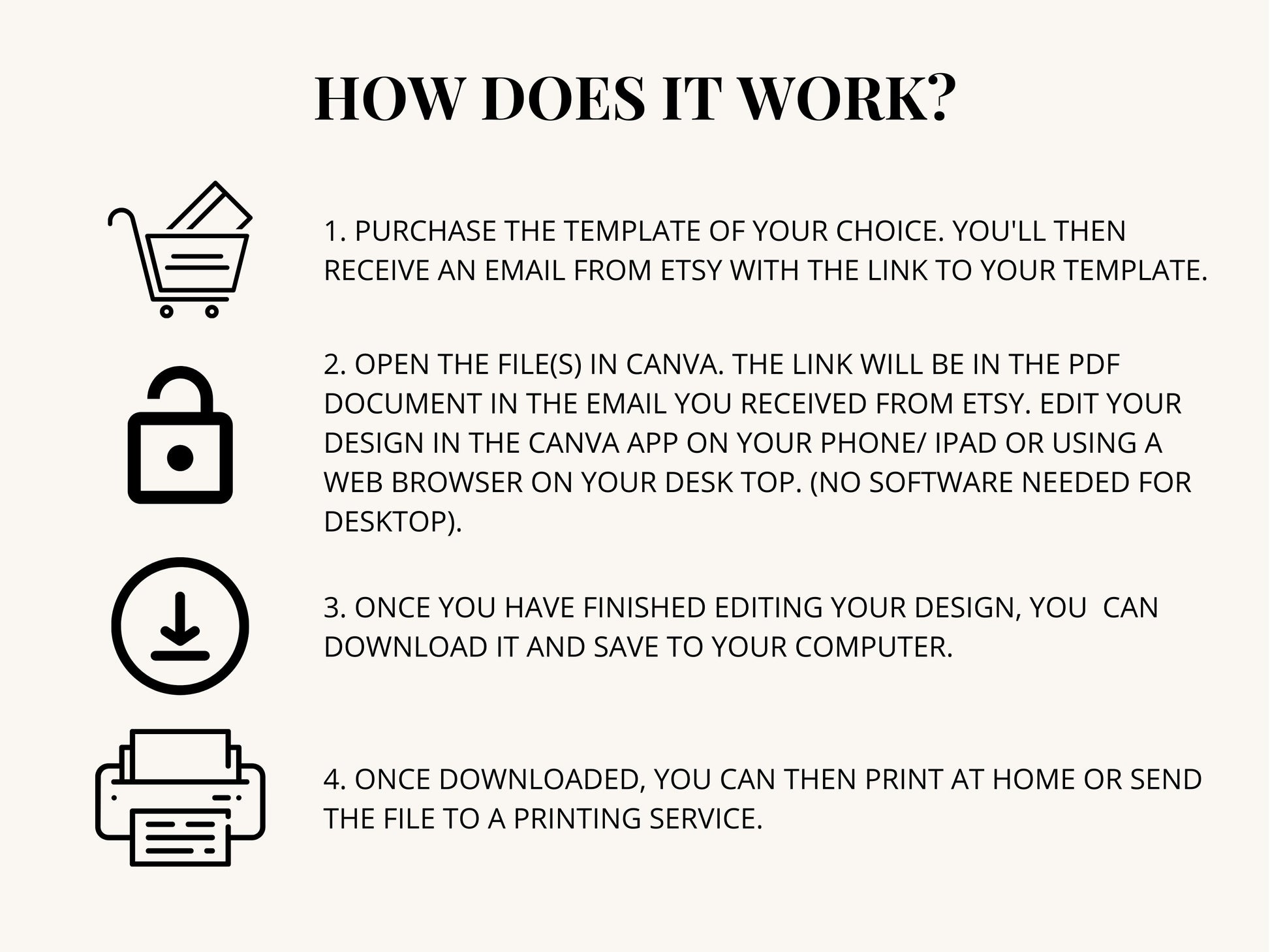 After you place your order, you will receive a link with access to your Canva self editable template where you will be able to customise with all your own details! Canva is a website which you can use for free to completely personalise your printable at home, directly in your browser. No need to download any other fonts or software.