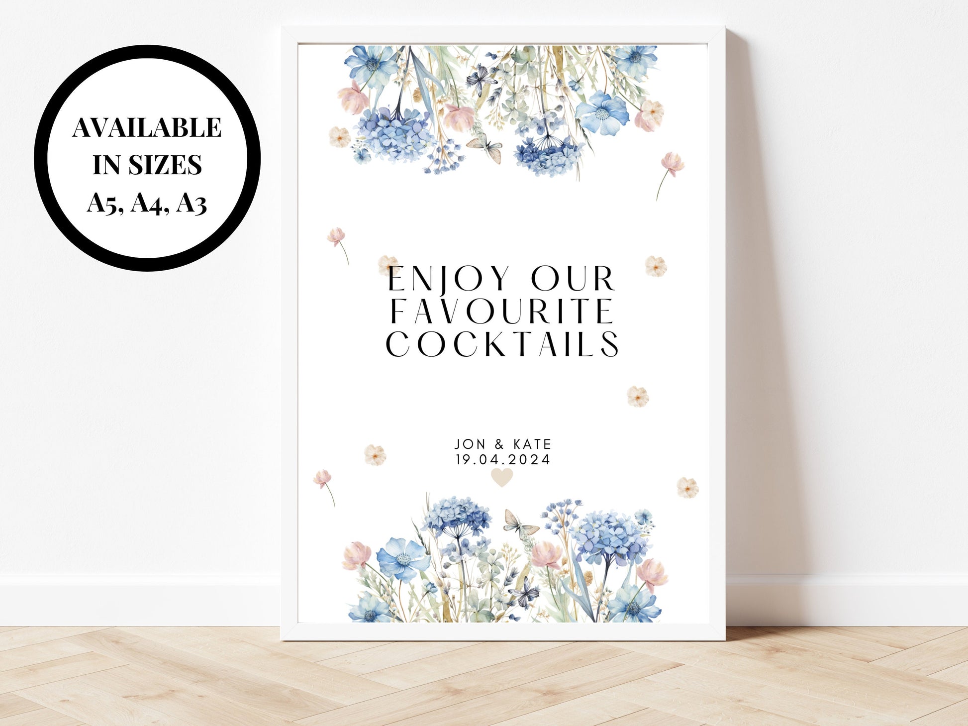Enjoy our Favourite Cocktails Sign/ Personalised Blue Theme Wedding Reception Get to Know the Newlyweds Bride and Groom/ Drinks Bar Alcohol.