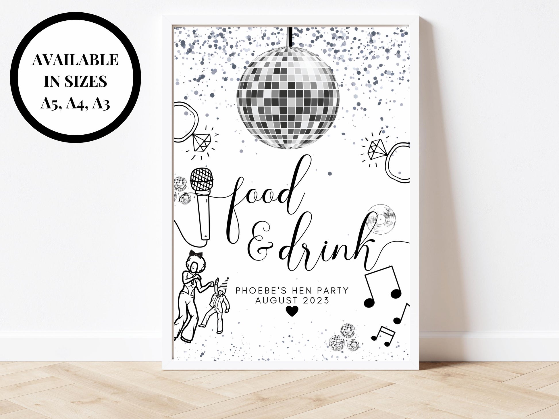 Food and Drink Sign/ Personalised Silver Disco Ball Hen Party Decor/ Bridal Shower Keepsake/ Silver Theme Bachelorette/Last Disco as a Miss.