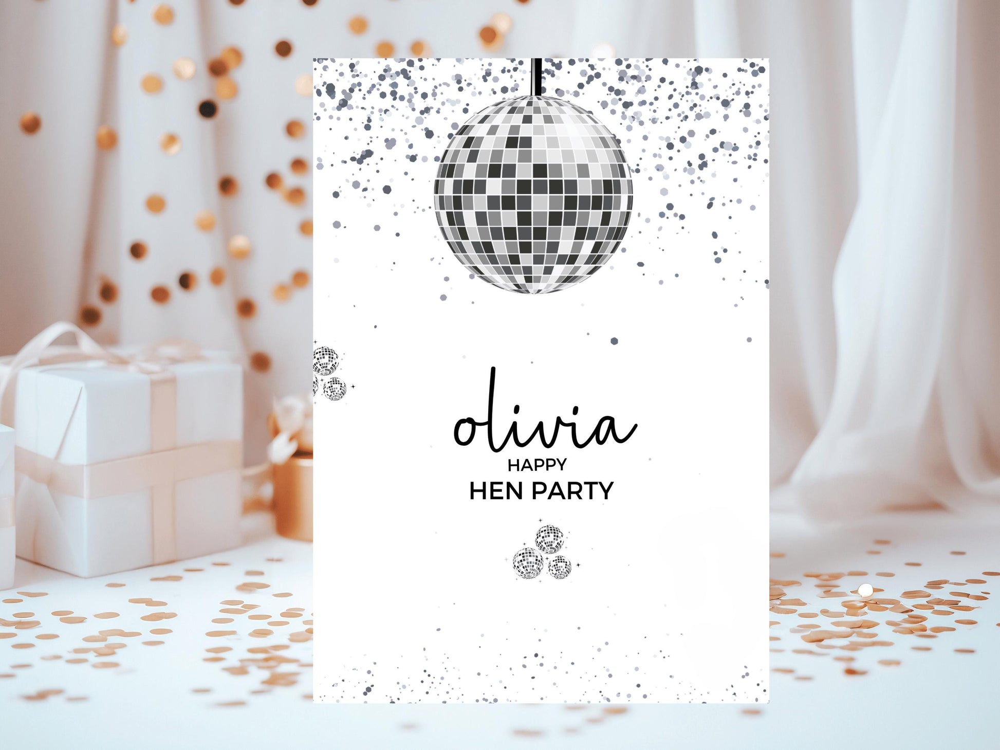 Happy Hen Party Card/ Personalised Silver Disco Ball Hen Party Greetings Card/ Team Bride Bridal Shower/ Last Disco Bachelorette Card