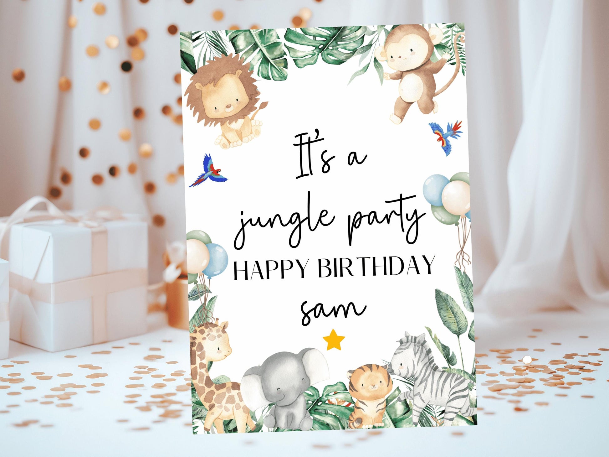 Its a Jungle Happy Birthday Party Card/ Safari Theme Birthday Greetings Cards/ Childrens Birthday Party/ Jungle Animals/ King of the Jungle.