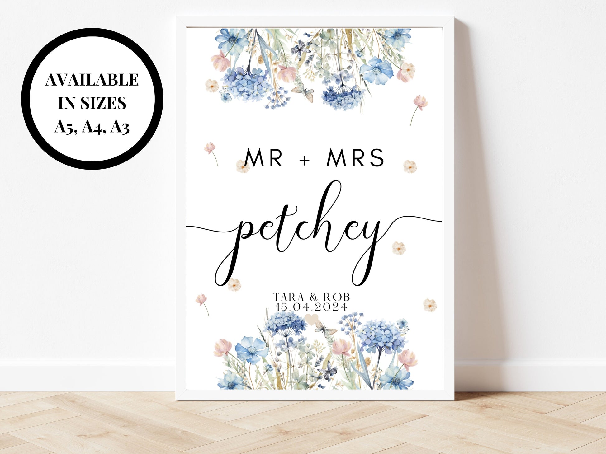 Mr and Mrs Sign/ Personalised Blue Theme Wedding Reception Party Poster.
