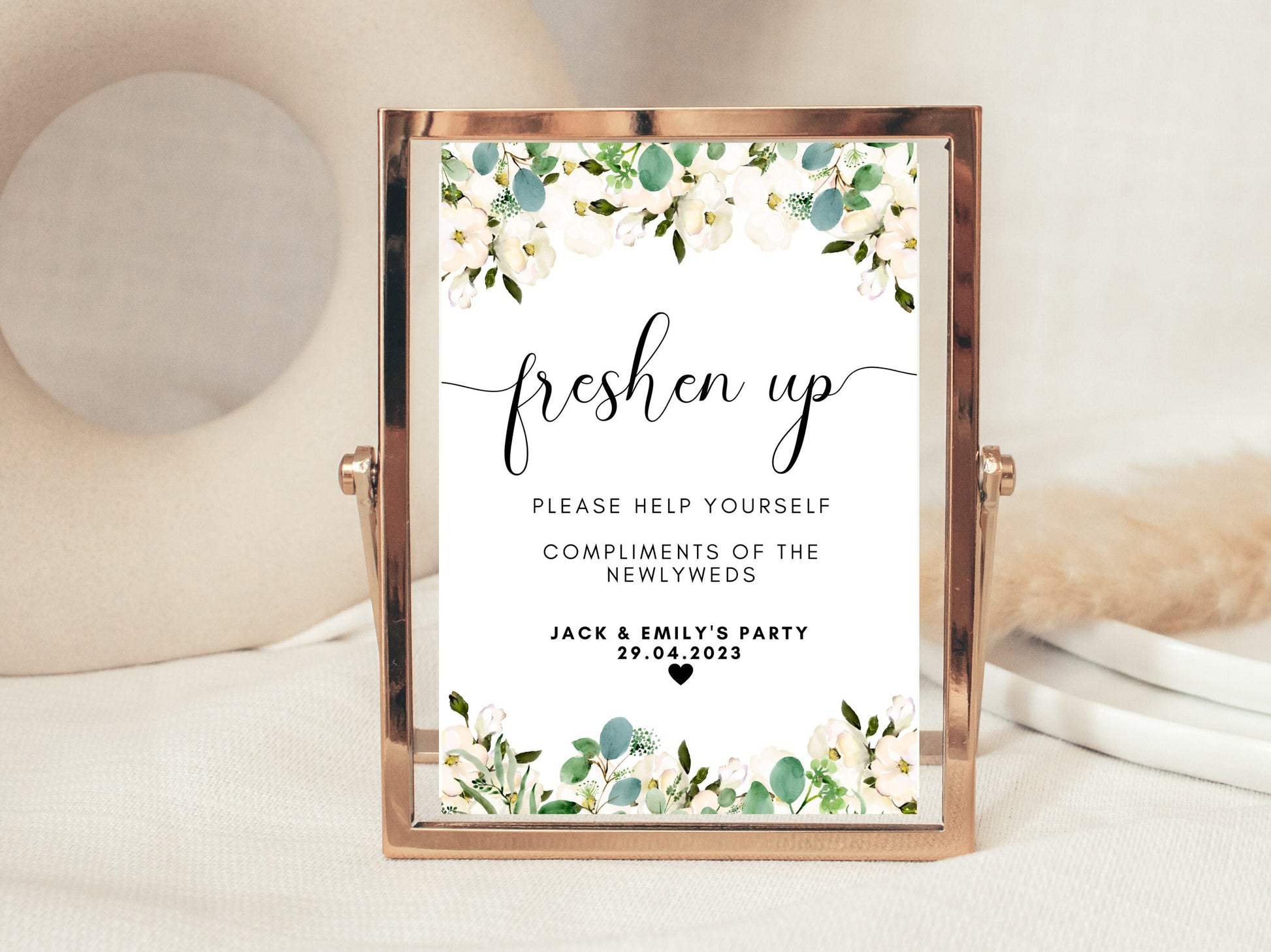 Personalised Freshen Up Sign/ Greenery Floral Wedding Reception Please Help Yourself Compliments of the Newlyweds/ Eucalyptus Hen Party