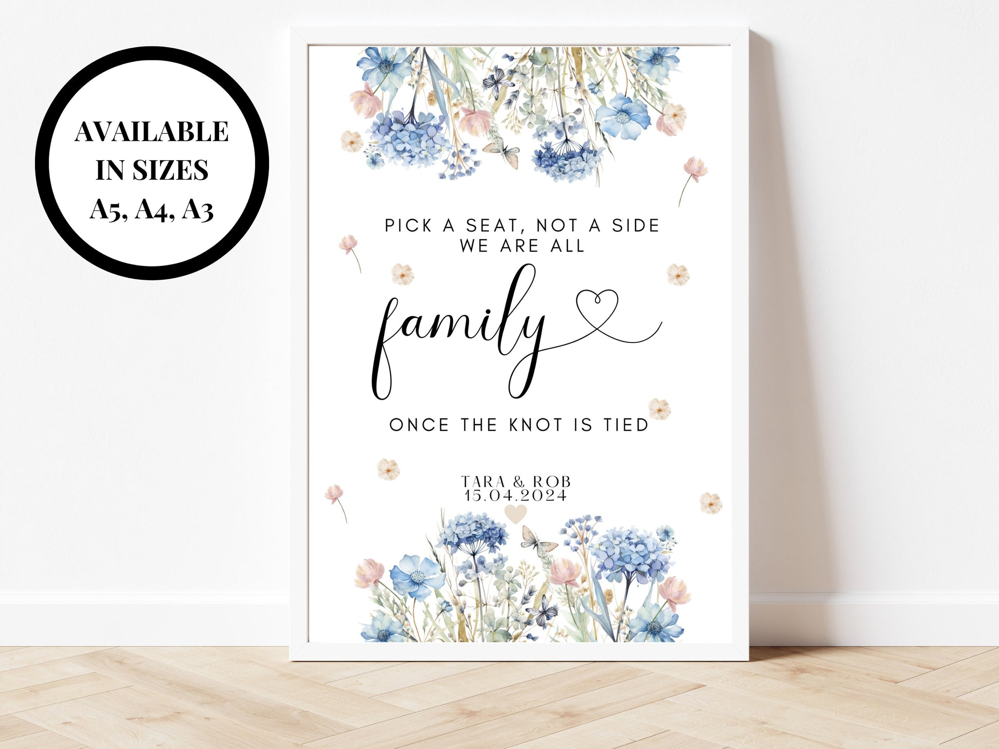 Pick a Seat Not a Side We Are All Family Once the Knot is Tied Wedding Sign/ Blue Theme Wedding Reception Seating Poster/ Floral Pastel.