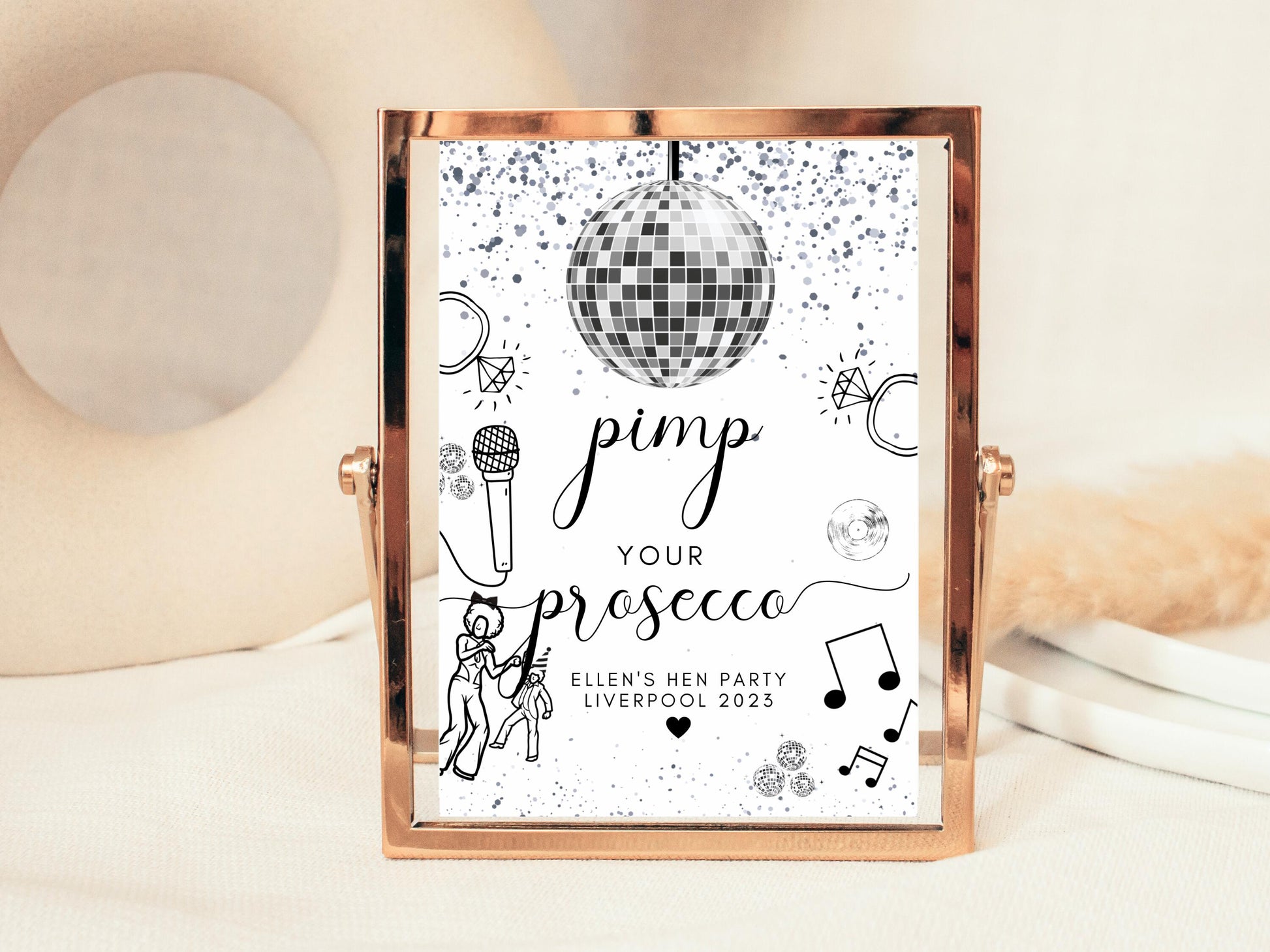 Pimp Your Prosecco Station Sign/ Personalised Silver Disco Ball Hen Party/ Drinks Alcohol Cocktail Bridal Shower/ Silver Last Disco Poster