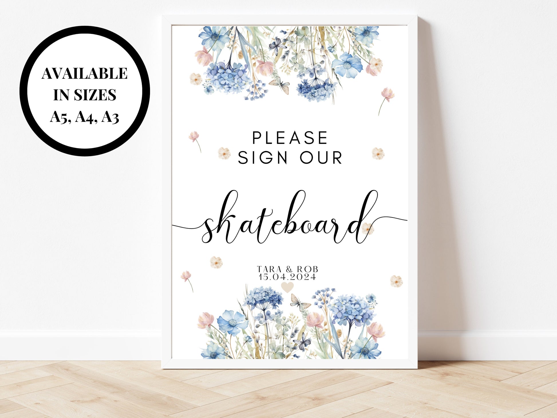 Please Sign Our Skateboard Sign/ Blue Theme Wedding Reception Poster/ Novelty Keepsake Venue Poster/ Floral Pastel Neutral