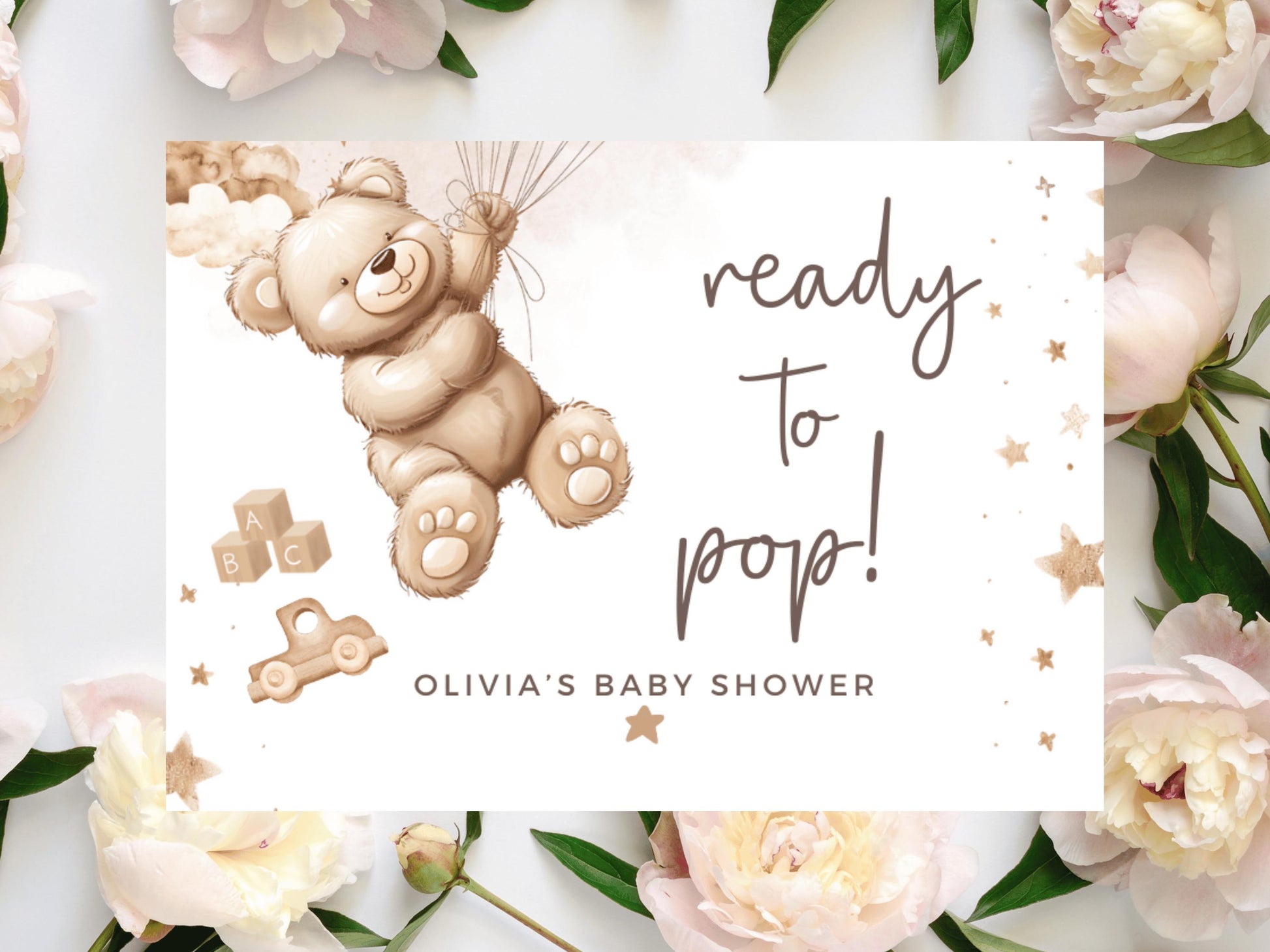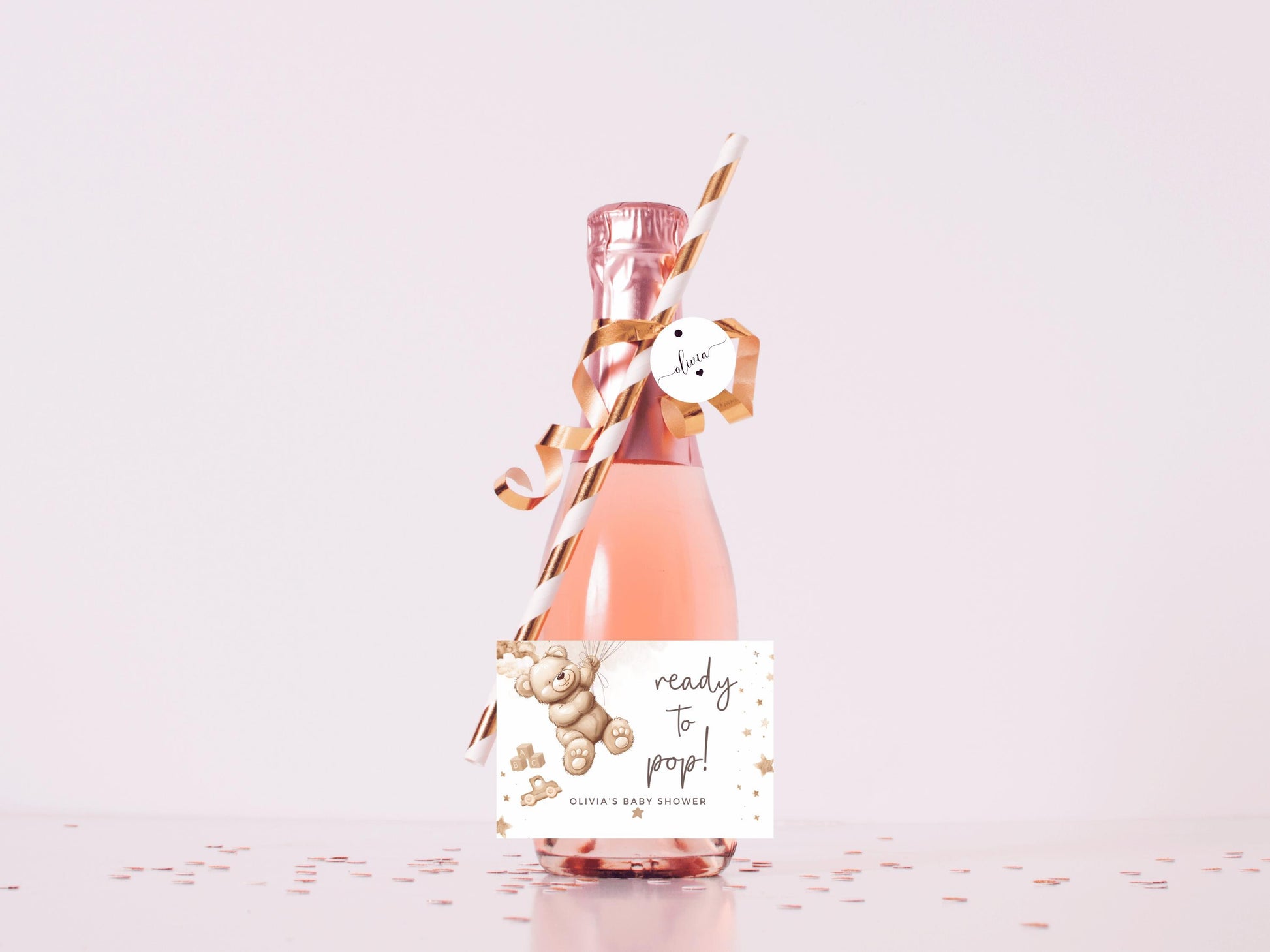 Ready to Pop Baby Shower Prosecco Bottle Stickers/ Personalised Neutral Gender Reveal/ Brown Teddy Bear Balloons/ We Can Bearly Wait Label.