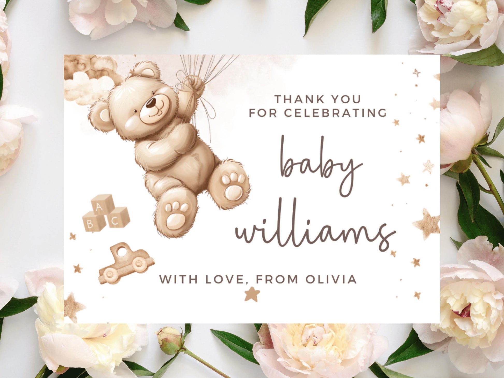 Thank You for Celebrating Baby Prosecco Bottle Stickers/ Personalised Neutral Brown Teddy Bear Balloons/ We Can Bearly Wait Mummy Label.