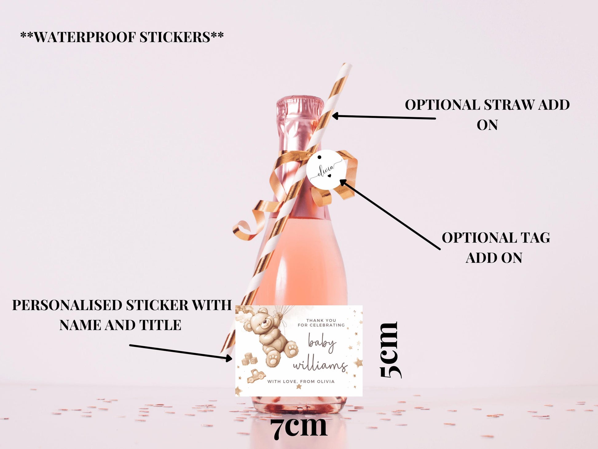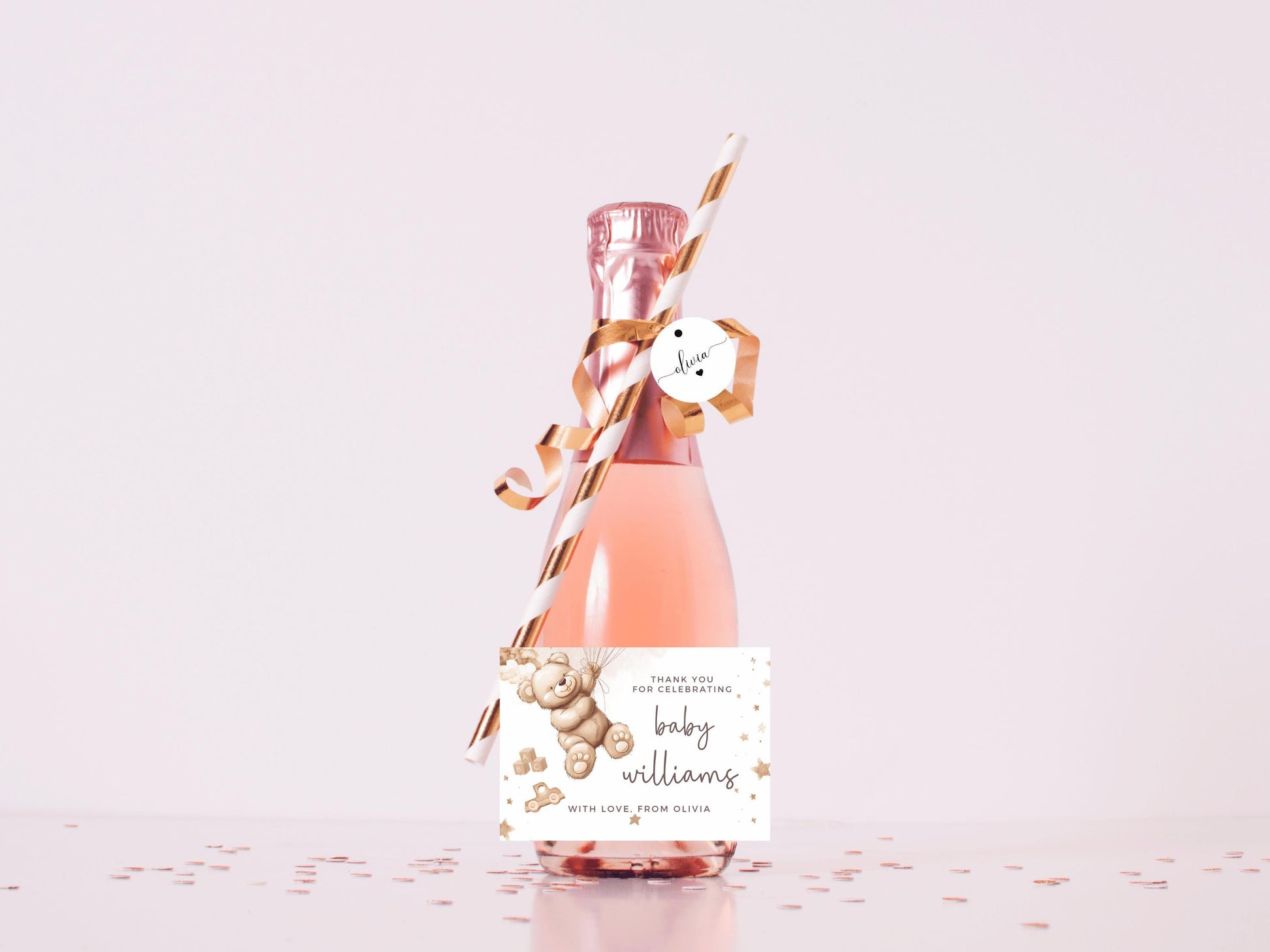 Thank You for Celebrating Baby Prosecco Bottle Stickers/ Personalised Neutral Brown Teddy Bear Balloons/ We Can Bearly Wait Mummy Label