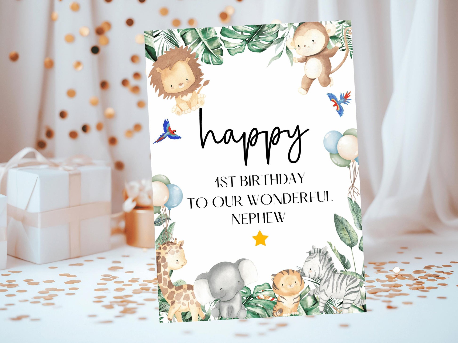 To Our Wonderful Nephew Happy 1st Birthday Card/ Safari Theme Birthday Greetings Cards/ Childrens Birthday Party/ King of the Jungle Card