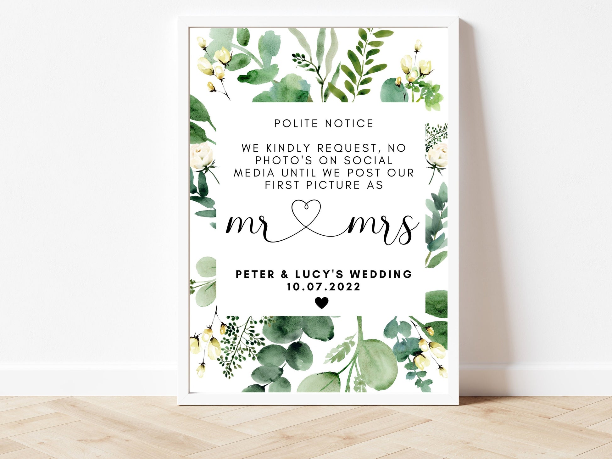 Wedding No Photos Sign/ Kindly Request No Photos or Social Media Signage/ Reception Print/ Eucalyptus Floral Greenery Photography Poster