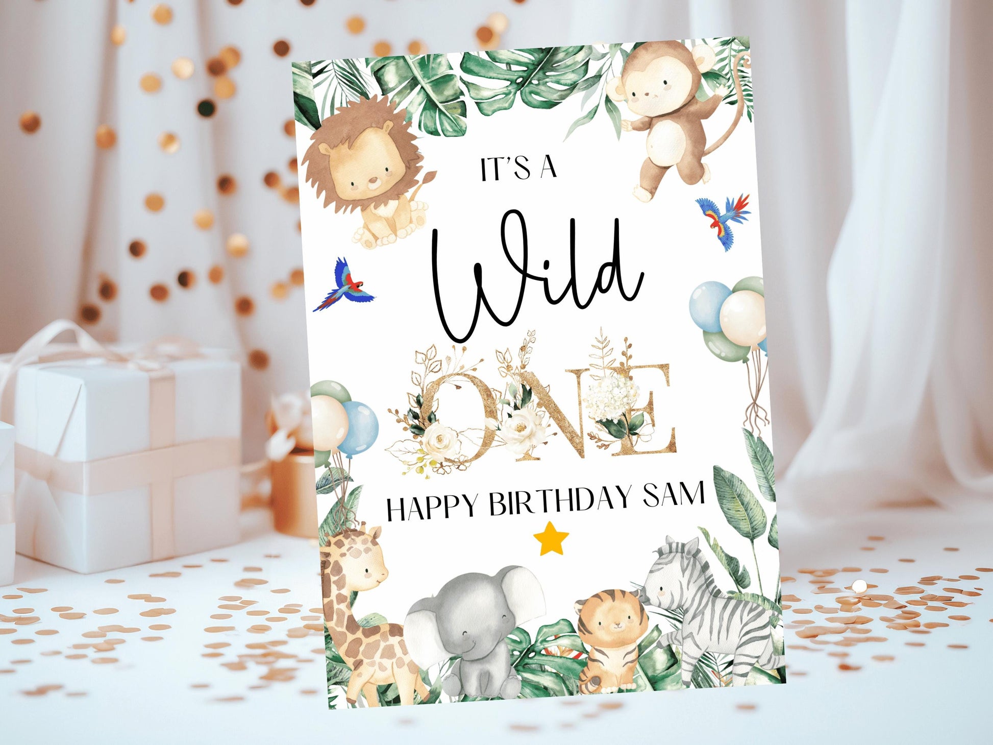 Wild One Happy Birthday Card/ Safari Theme Birthday Greetings Cards/ Childrens Birthday Party/ Jungle Animals/ King of the Jungle Card